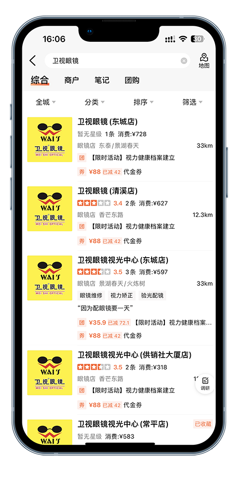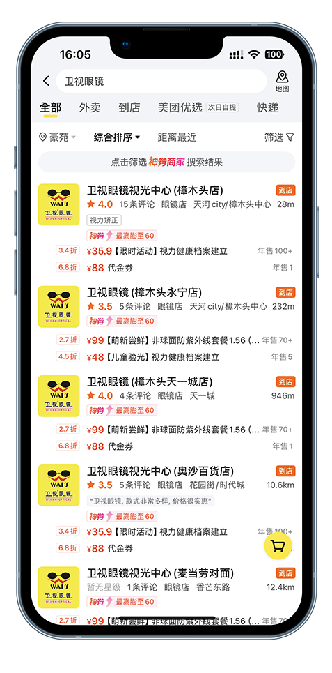 卫视眼镜入驻美团、大众点评平台,为消费者提供商户信息、消费点评及消费优惠,带来更好的O2O购物体验。